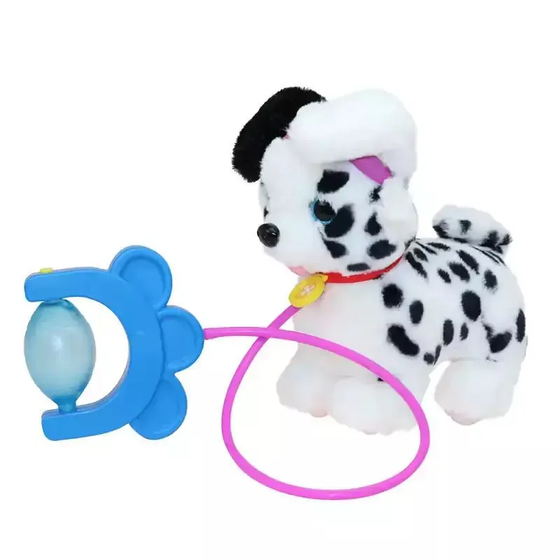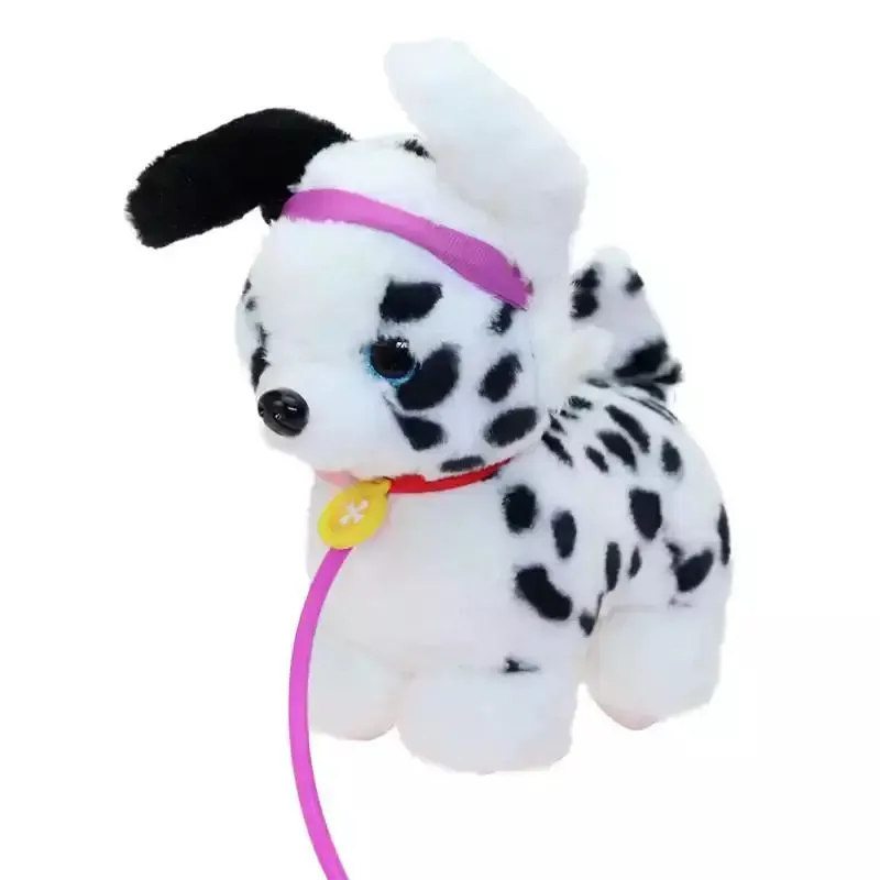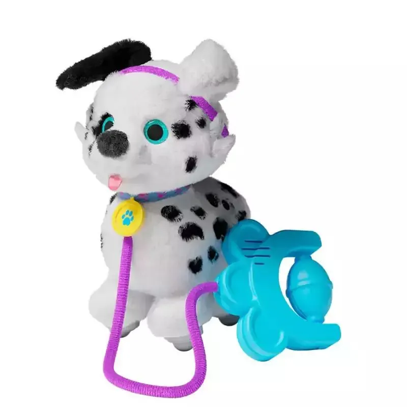 Είναι χνουδωτό και πολύ απαλό με μαύρες βούλες και λευκό χρώμα. Διαθέτει λουράκι σε ροζ και μπλε χρώμα το οποίο πιέζοντάς το σηκώνει τα αυτιά και την ουρά του. Τα ειδικά ενσωματωμένα ροδάκια στις πατούσες του, του επιτρέπουν να κινείται σταθερά και γρήγορα. Παράγει ήχους αληθινού κουταβιού που γαβγίζει. Πάρε το κουτάβι σου και περπάτησε ή τρέξε μαζί του. Θα γίνει ο καλύτερος λούτρινος φίλος που είχες ποτέ στις βόλτες σου.