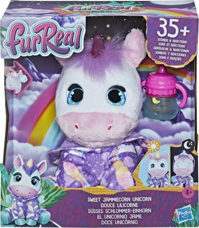 Furreal Sweet Jammiecorn Unicorn Με 35+ ήχους και αντιδράσεις Με κέρατο που φωτίζεται Περιλαμβάνεται μπιμπερό για να το ταΐσεις Κλείνει τα μάτια του για να κοιμηθεί Απαιτούνται 3 μπαταρίες AAA (περιλαμβάνονται)