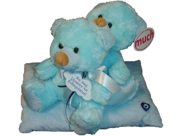 Λούτρινα αρκουδάκια σετ για δίδυμα σιέλ σε μαξιλάρι μπλέ με ματάκι γυάλινο για να ευχηθείτε σε νεογέννητα διδυμάκια! Ύψος: 28 εκατοστά.