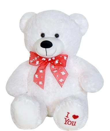 Απαλό και χνουδωτό λευκό αρκουδάκι με φιόγκο και μύνημα I Love You στην πατούσα